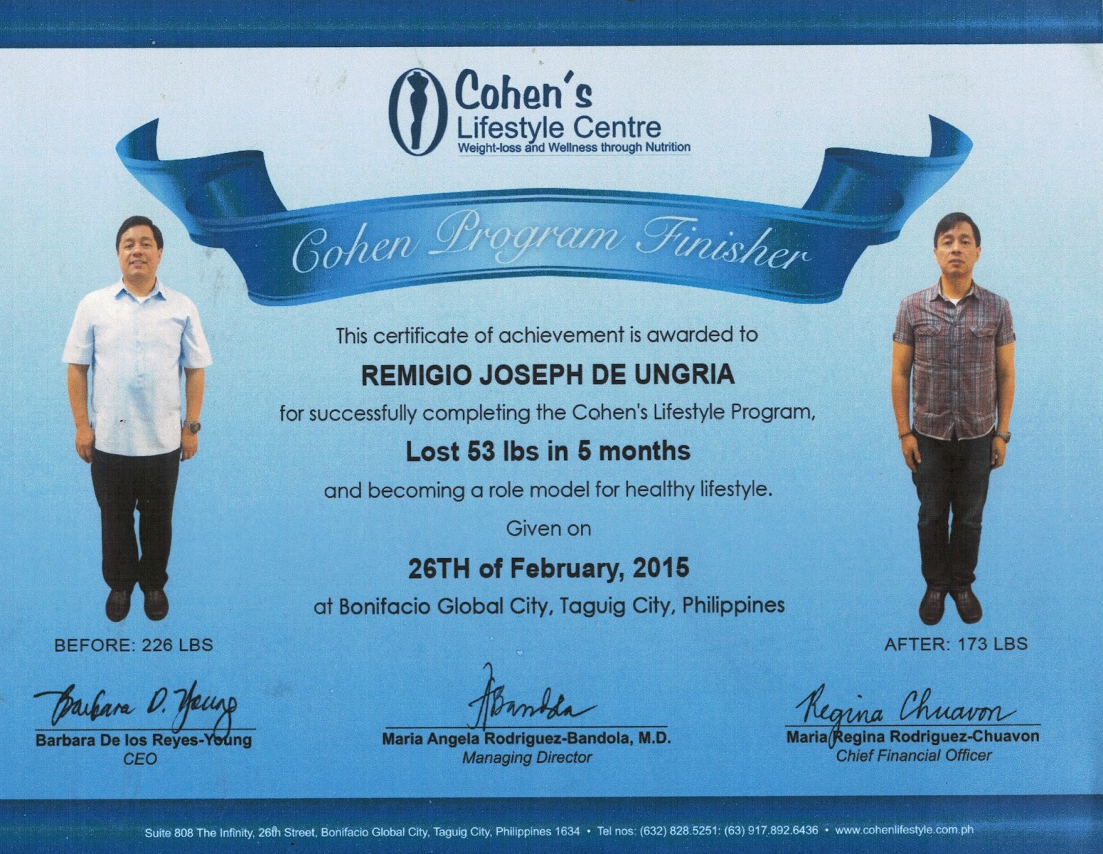 This was made possible with the knowledge, support and expertise in the Cohen lifestyle program. From 226 pounds in Sep 2014 to 173 pounds by Feb. 2015.