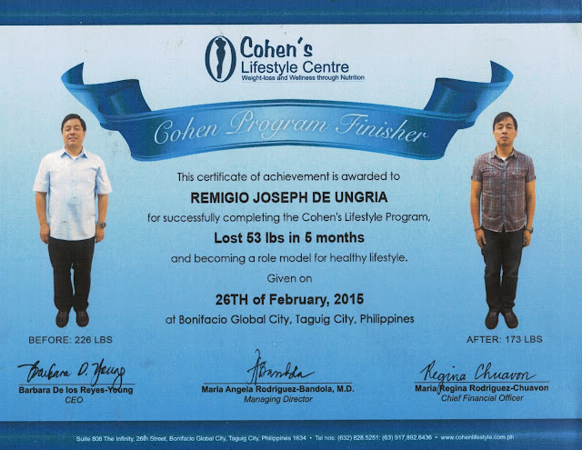 The Cohen lifestyle was relatively easy for me since I had the support of my wife and my officemates. I was fortunate to have had the budget to first enroll in the program and also enough to have my kasambahay, Ate Josie, attend 12 Cohen cooking classes, so she can prepare all my meals, all the days of the week. I just put everything she cooks in 1 bag I bring everyday.