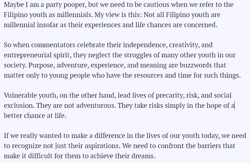 Dr. Jayeel Cornelio (2016) @ Rappler focused on Defining Filipino millenials and wrote that the way forward was this: