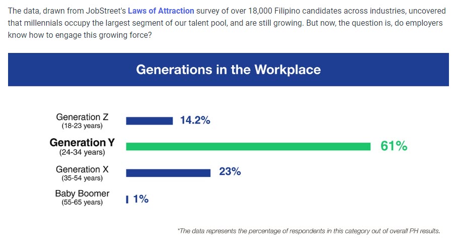 Jobstreet’s Law of Attraction survey of over 18,000 Filipino jobseekers revealed the generations in the workplace as follows: