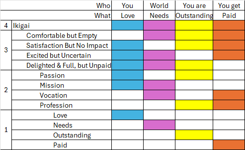 In summary, Ikigai is the ultimate being-ness all 4 areas of Love, Need, Outstanding &Payment.