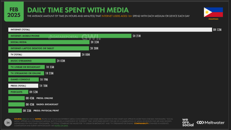 However, I will offer a thought provoking headline for each of my favorite tables from the “We are Social” 2025 Philippine report- to serve as a catalyst for your own exploration and reflection on how it applies to your context and need.