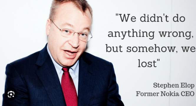 A cheery statement, but the exact opposite is what actually happened. Before Elop joined Nokia, they had a 33% market share in the smartphone market itself. But when he left, they had less than 3%.