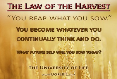 The Law of the Harvest is: you reap (or harvest) only what you sow (plant). There is no harvest if there was no seed planted at the start of the season, nurtured, and cultivated by hard work and sun and water months prior. You cannot plant 100 seeds and expect to harvest 900 fruits (the numbers are figurative). To harvest more, you must plant more, work more. The rewards are greater at the end for those who put in more. Those who are truly happy enjoy both the journey and the destination.