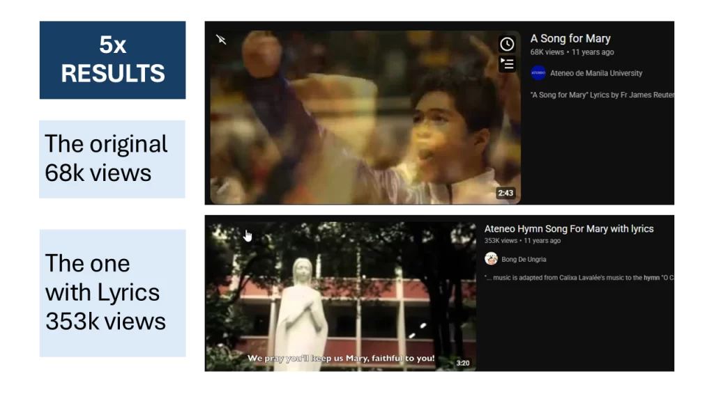 Fast forward to today. I re-uploaded the exact same video—same song, same visuals—except now I added lyrics on screen.