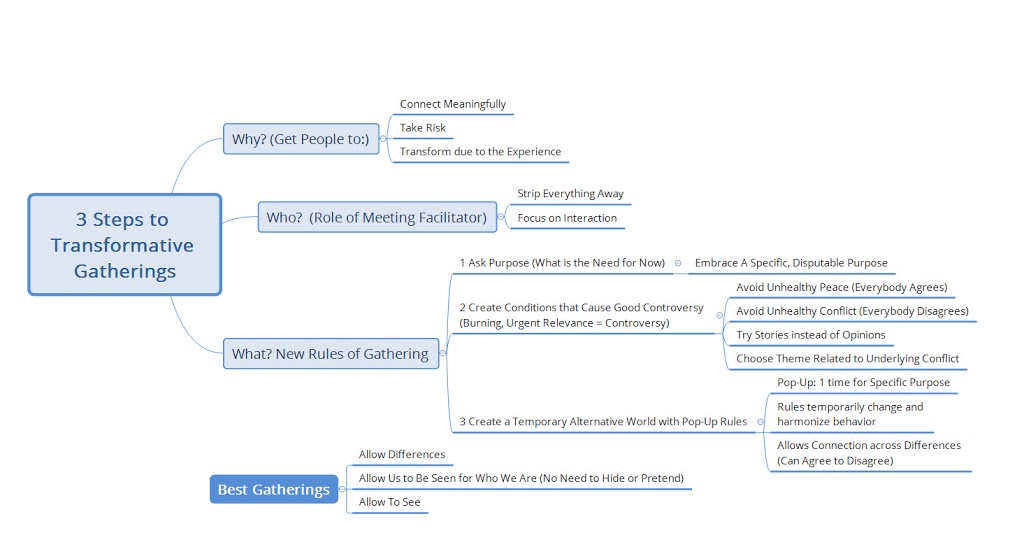 Whethere a meeting or gathering is on-line or not, it would be great if it actually fulfills its purpose. Below is a useful  mindmap of a Ted Talk by Ms. Priya Parker on 3 Steps to Transformative Gatherings: