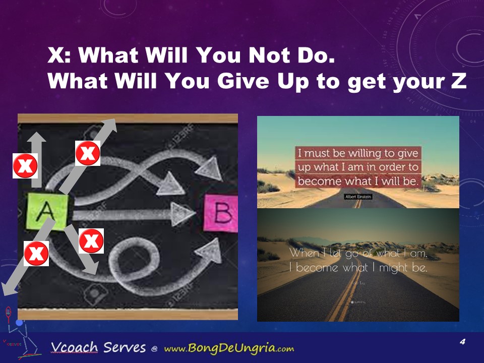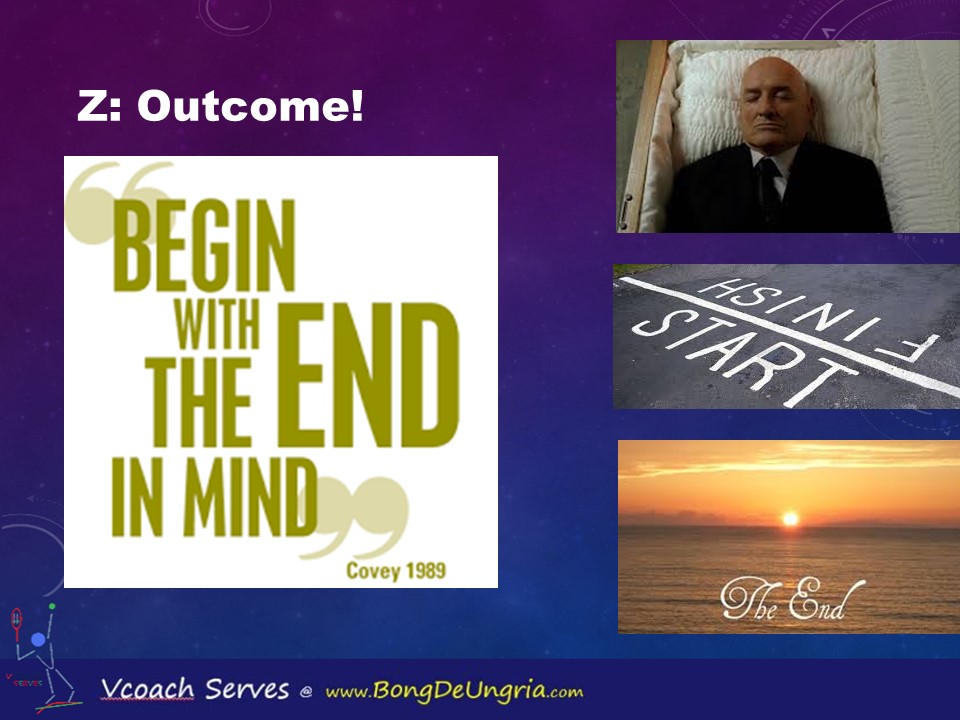 Z represents the outcome, what we really want. It is the End in Mind habit of Steven Covey. Z is the vision and mission of companies. It is the Vision Board that young children are asked to make or the visualization that athletes do. Z is the non-negotiable, the end point that cannot be changed no matter what happens.