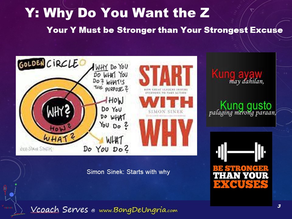 If your Ys are stronger than your strongest excuse, then you will achieve the Z. In Filipino, we have the saying: Kung Away may Dahilan, Kung Gusto may Paraan.